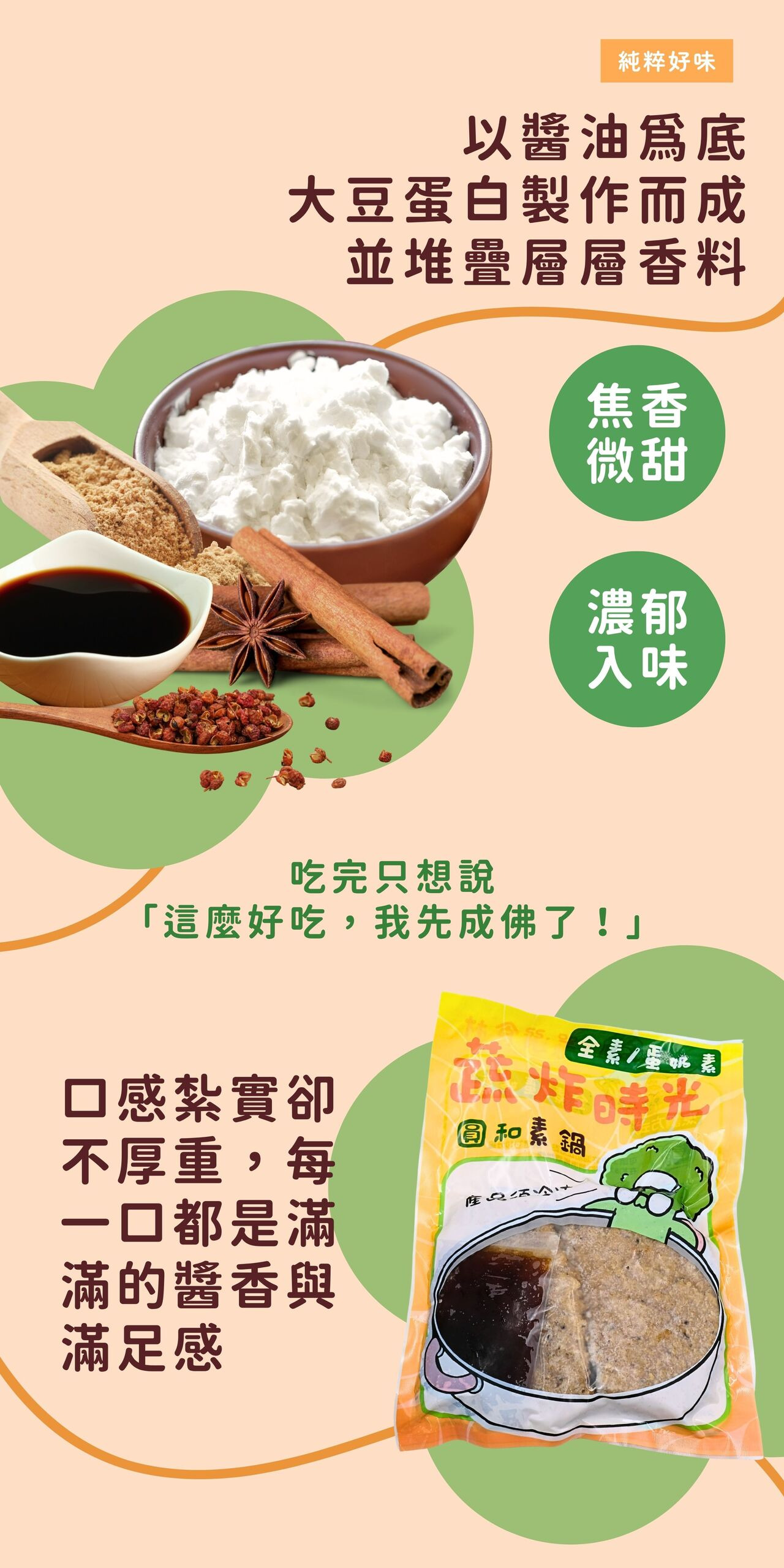 ➡️ 成分 : 水、棕櫚油、大豆蛋白、醬油、脫脂豆粉、地瓜粉、蛋白粉、酵母抽出物、玉米澱粉、香料、砂糖、肉桂、花椒、大茴、小茴、丁香、食鹽、黑胡椒粒、白胡椒粉、馬鈴薯澱粉、薑母粉。