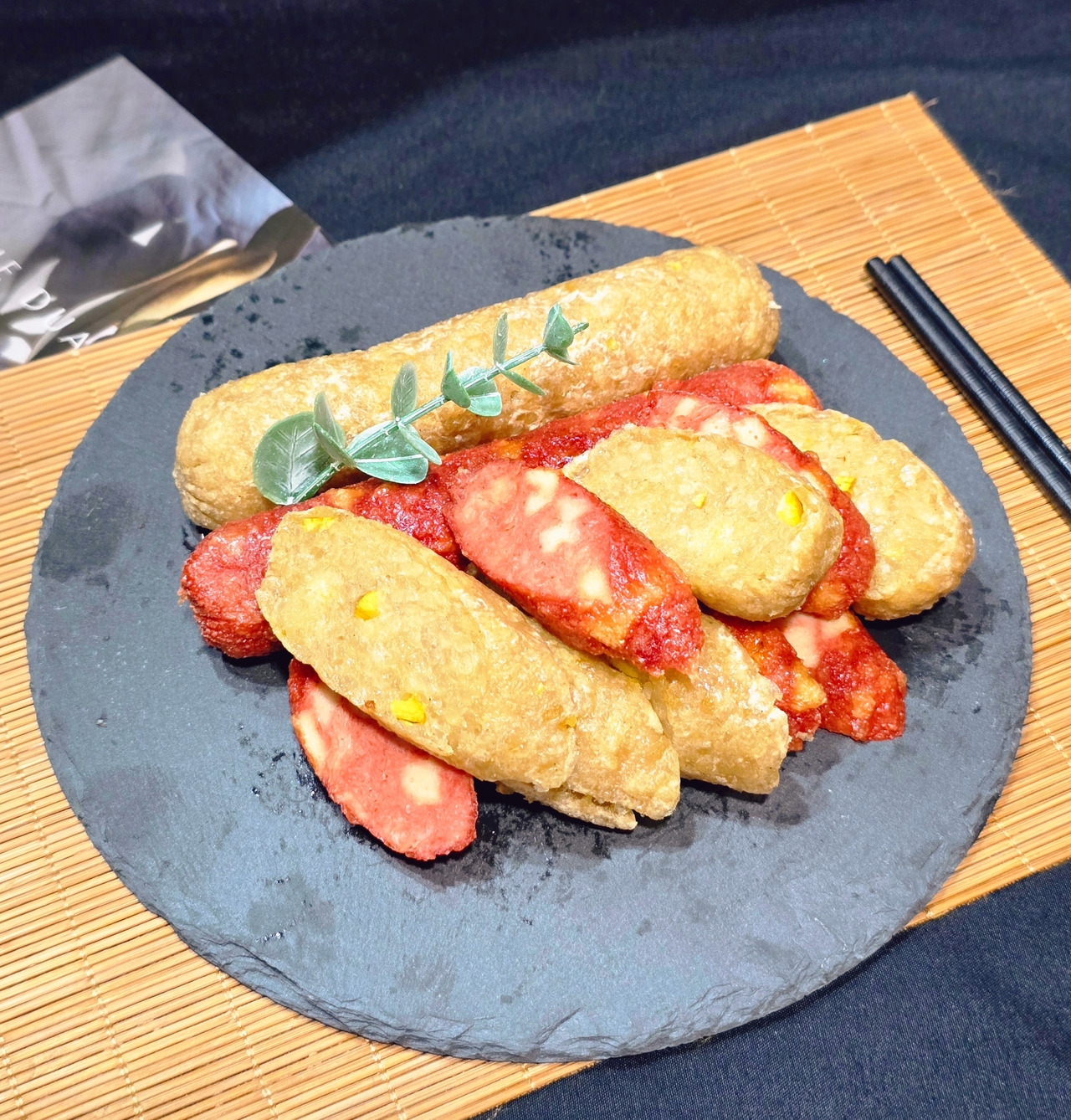 ➡️ 香腸成分 : 非基因改造大豆纖維, 非基因改造大豆蛋白, 非基因改造大豆油, 蒟蒻粉, 糖, 鹽, 紅麴米粉, 肉桂粉、